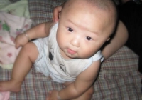 今天上午蓬蓬妈发短信说,蓬蓬会爬了。 呵呵,想想蓬蓬爬的样子,一定很可爱。 上个星期,蓬蓬趴着,在他前面放上玩具,他用双手和双脚支撑着身体, 双脚只能左右动不会前后动,看着玩具就在前面拿不到干着急。 这回好了,可以爬着冲过去抢了。